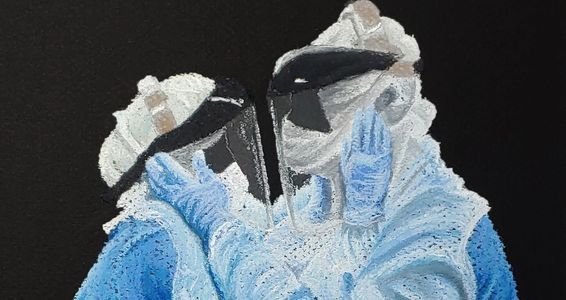 Cody's pastel drawing of two nurses titled, "Embrace," is selected in the top 100 for the Art Saves Humanity Exhibition. The show is on display from May 21st, 2020.