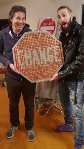 Scott Froschauer, known for his customized street signs entitled, "Word on the Street," partners up with Cody to create a "Change" sign made with change. It is made to the exact specifications of a Stop sign, except it says, "Change," and is covered in pennies, nickels, dimes, and quarters.